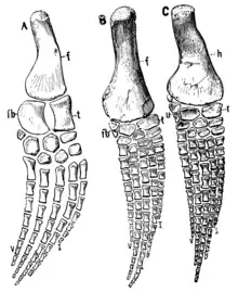 Whales and their relatives have a soft tissue flipper that encases most of the forelimb, and elongated digits with an increased number of phalanges.[9] Hyperphalangy is an increase in the number of phalanges beyond the plesiomorphic mammal condition of three phalanges-per-digit.[10] This trait is characteristic of secondarily aquatic vertebrates with flippers. Hyperphalangy was present among extinct ichthyosaurs, plesiosaurs, and mosasaurs.[11]