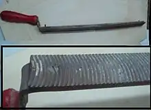 A woodworking float (more rarely used in silversmithing),[1] also called a planemaker's float, is a tapered, flat, single cut file[2] of two types: edge float and the flat sided float[3] which are traditional woodworking tools generally used when making a wooden plane. The float is used to cut, flatten, and smooth (or float) key areas of wood by abrasion. Despite the name its woodworking uses go well beyond planemaking.