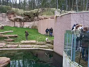 On 8 April 2008, Flocke made her first public appearance in the polar bear enclosure that had once been home to Vilma; the adult polar bear had been relocated to another zoo. The four-month-old cub was greeted by more than 160 journalists and a half-dozen international camera crews on the first day.[13] During the first week, Flocke was displayed for short intervals with breaks at midday. Expecting a peak of 20,000 visitors, the zoo built a viewing platform, capable of holding 500 people at a time, in front of the enclosure,[14] but attendance by zoo patrons was initially lower than expected.[15] The zoo uses a video transmission and recording system from Bosch Security Systems to transmit TV-quality live images of the cub to a pair of 46-inch (1,200 mm) large-format screens. This system, which includes one screen outside the enclosure, was implemented to help the zoo meet the demands of visitors wanting to catch a glimpse of Flocke.[16]