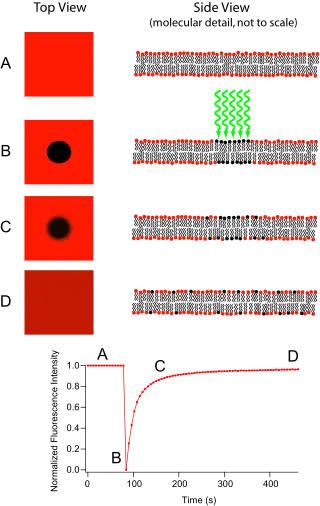 Principle of FRAP A) The bilayer is uniformly labeled with a fluorescent tag B) This label is selectively photobleached by a small (~30 micrometre) fast light pulse C) The intensity within this bleached area is monitored as the bleached dye diffuses out and new dye diffuses in D) Eventually uniform intensity is restored