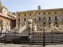 The Praetorian Fountain (Italian: Fontana Pretoria) is a monumental fountain located in Piazza Pretoria in the historic center of Palermo, region of Sicily, Italy. The fountain dominates the piazza on the west flank of the church of Santa Caterina, and is one block south of the intersection of the Quattro Canti. The fountain was originally built in 1544 in Florence by Francesco Camilliani, but was sold, transferred, and reassembled in Palermo in 1574.