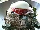 The National Intangible Heritage Centre and at the Hanok village in Jeonju the gastronomic capital of Korea, a festival is held every October promoting Jeonju's representative food, Bibimbap. Jeonju Bibimbap is usually topped with quality Jeonju soy bean sprouts, hwangpo-muk, gochujang, jeopjang, and seasoned raw beef and served with kongnamul-gukbap. The rice of Jeonju bibimbap is specially prepared by being cooked in beef shank broth for flavor and finished with shiteme oil for flavor and nutrients.[18] Many local cooks and public figures introduce their own unique variation of Bibimbap along with other local cuisines. Major programs include the gigantic Bibimbap made by all the participants- capable of feeding a 1000 people, a cooking contest for foreigners and an event called find Bibimbap.[19][20][9]