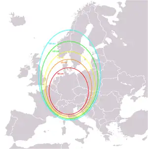 An example of an elliptical footprint with a reception area of Germany, Austria and Switzerland. The ellipses indicate the necessary antenna diameter for receiving in cm.