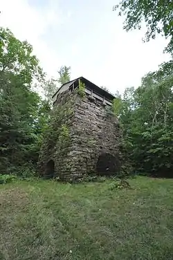 The furnace was established in 1810 by John Smith of Leicester, Vermont, and was in operation, under a variety of names and owners, until 1855. Brown hematite ore from nearby beds was processed with local charcoal to produce iron, which was formed into utilitarian implements such as stoves, agricultural implements, and hardware. The works was not particularly efficient, and its sales were hampered by a poor transportation network. More advanced and better-connected works, particularly in Troy, New York, contributed to its downfall, and the site was abandoned in 1855. It was given to the state in 1974.[2]