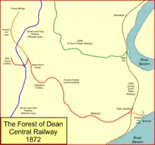 Much of the land was leased from the Crown at a rent of £100 a year, and the company was required to fence it throughout. It was decided that the sections from the South Wales Railway to New Fancy Colliery, and from Moseley Green to Foxes Bridge with the branch at Brimspill, should be built in two successive years. Plans were already being made for extending the line, and on 29 November 1856 an application was published for the Forest of Dean Central, Lydbrook & Hereford, Ross & Gloucester Junction Railway. This would extend the Forest of Dean Central Railway to the Hereford, Ross and Gloucester Railway line near Mitcheldean Road station, with a later extension to Ledbury. This was presented to Parliament in the 1857 session, but in fact no powers for the work were obtained. (In the 1870s a line was built on part of the intended route by the Mitcheldean Road and Forest of Dean Junction Railway.)[1][3]