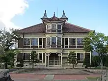 The design of the building is attributed to Egawa Saburōhachi (江川三郎八), whose plan was executed by carpenter Ogasawara Kunitarō (大工小笠原国太郎) of Iizaka. The house is made of wood and includes two floors of tatami mat rooms, as well as an attic floor with an East Asian hip-and-gable roof covered in tile. The exterior of the house is pale yellow in color and takes on a Western appearance. In the center of the facade of the house is a tower with an eight sided room protruding from the third floor. The interior of the house is Japanese is style. Wide washitsu rooms are arranged in the center of each floor.[1] Detailed woodwork using valuable wood, including Japanese zelkova and imports from Southeast Asia are spread throughout the house. Two rooms on the first floor are especially well decorated, including the ceiling and wall fixtures of the main living room.[2] On July 25, 2016, the house was designated as an important cultural property of Japan.[1]