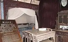 This is where little Zhou and his mothers lived. Zhou is the eldest grandson of his family. His parents gave him the name "Da Luan" (大鸾. It is a kind of bird which is similar to a phoenix. In China, these birds symbolizes auspice and happiness.) He has three mothers. First is his biological mother, Mrs Wang (万十二姑). Mrs Wan was educated in the family school for about 6 years. So she paid attention to Zhou's education. The second mother is Mrs Chen. Mrs Chen is Zhou's adoptive mother and also his aunt. Zhou's uncle was seriously ill and dad no child. In old days in China, there was a saying that of all who lack filial piety, people who has no children are the worst. (不孝有三,无后为大) So the couple adopted Zhou in order to make his uncle happy and remove his disease. (In the old days, it was called "冲喜 Chongxi") Mrs Chen was born to a scholarly family and was a typical Chinese woman. Her father was a Xiu Cai in the Qing Dynasty. So she taught Zhou a lot of knowledge. When he was 4 years old, Mrs Chen taught him some Chinese words and some poetry of the Tang Dynasty. Zhou was sent to the family school at the age of 5. After school, Zhou always listened to Mother Chen telling some historical stories. Zhou read Three Character Classic (三字经), Thousand Character Classic (千字文), Great Learning (大学), The Analects (论语) and Mencius (孟子) with the help of Mother Chen. The third mother of Zhou is Mother Jiang. Mrs Jiang was Zhou's wet nurse. She was a peasant woman. The characters of the plain peasant woman also influenced Zhou a lot. However, his mothers didn't accompany him for a long time. His biological mother died of Pulmonary disease at the age of 35 in 1907. One year later, his adoptive mother Mrs Chen also died. When he was 12, his father's elder brother brought him to the Northeast. As a result, he had to say goodbye to his wet nurse. These three women influenced Zhou Enlai greatly during his life.[3]