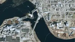 Satellite view of the bridge, on the right. A power dam is on the left.