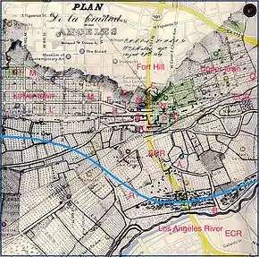 - ↑ Sunset Boulevard/César Chavez Avenue was not cut through until around 1900, by which time much of Fort Hill had been dug away.