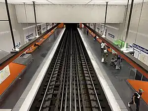 Fort d'Aubervilliers has a standard configuration with 2 tracks surrounded by 2 side platforms. The name of the station is written in Parisine font on enamelled plates. The platforms are devoid of seats and advertisements.