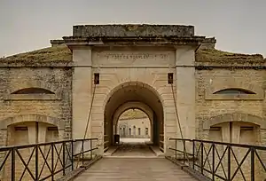 The preferred site was chosen in 1877 by a committee that included General Raymond Adolphe Séré de Rivières, and was expropriated from landowners that included the Prince Hénin. Construction began in 1878, with an approximate budget of 2 million francs-d'or. Construction was by Petit et Marey of Neufchâteau. Stone was quarried locally at Fréville and Rapailles, conveyed to the construction site by a railway line whose vestiges remain visible.[6] An 1880 project to install a Mougin casemate never came to fruition. The fort was away from the fighting during the First World War. During the Second World War the Germans used the fort as a depot. An explosion caused numerous German casualties. The Germans stripped the fort of armament and metals between 1941 and 1944.[7]