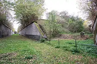 The Brialmont forts were designed to be protected from shellfire equaling their heaviest guns: 21 cm.[4] The top of the central massif used 4 metres (13 ft) of unreinforced concrete, while the caserne walls, judged to be less exposed, used 1.5 metres (4.9 ft).[5] Under fire, the forts were damaged by 21 cm fire and could not withstand heavier artillery.[6]
