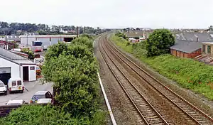 The original Foryd station was opened on 5 October 1858 and was situated on the Denbigh, Ruthin and Corwen Railway,[2] incorporating a station house designed by the Denbigh firm of Lloyd Williams and Underwood.[3] The station was then moved to its second site, this time on the North Wales Coast Line, on 20 April 1885.[4] where it remained until its closure in 1948. There were four tracks running through the station, two slow and two fast, with the two platforms located adjacent to the slow tracks.