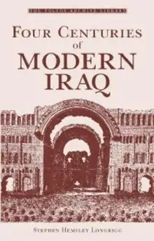 Four Centuries of Modern Iraq is a historic book authored by Stephen Hemsley Longrigg published first time in United Kingdom on 1925. It covers events in Iraq between early 16th century to early 20th century when Iraq was a neglected part of the Ottoman Empire. Few books have been written about Iraq in that period.[1] The author uses oriental sources, the books of Iraqi historians and the experience of his long residence in Iraq to discuss the country’s turbulent history.[2] The author concludes that Iraq had made little progress during the last four centuries and it still lacked the ability and resources to be independent and self-govern.[3]
