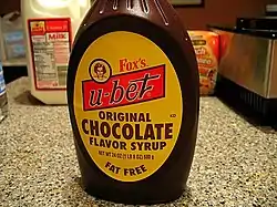Fox's U-bet chocolate syrup is a commercial chocolate syrup originally made by H. Fox & Company in Brooklyn, New York starting around 1900.[1][2] It was said to be invented in a basement in Brownsville, Brooklyn, according to David Fox. Herman Fox, his grandfather, left town for the Texas oil boom and returned only with the phrase, "you bet."[3] The product is most associated with the egg cream fountain beverage.[4] The egg cream, a mix of U-Bet syrup and seltzer, became a staple in Ashkenazi Jewish cuisine.[5] H. Fox & Company was acquired by US Westminster Foods in 2016.[6]
