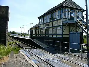 The station is unstaffed, but has now been equipped with a ticket vending machine to allow travellers to purchase tickets prior to joining the train.[6] Train running details are available by telephone, digital information displays and timetable posters; the National Rail website also states that public wi-fi access is available there. Step-free access to the platform is via a foot level crossing by the signal box.[7]
