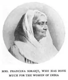 Francina Sorabji founded the Victoria High School for girls at Poona, at first in her own home, and later in a separate stone building. The school was co-educational and enrolled all ages from young children to college-aged youth. At its peak Victoria High School counted a student body of 400. Her own daughters were among the first students.[7] She founded two other schools in Poona: one with teaching in Marathi for Hindu children, and one with teaching in Urdu for Muslim children; these were run by her daughters Zuleika, Susie, and Lena. Another daughter, Mary Sorabji, taught at the High School for Indian Girls in Poona.[2][8] She encouraged her students, and her seven daughters, into high education and professions, including law, medicine, and midwifery.[9][10]