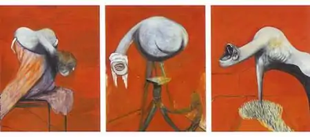 By 1944 Bacon had gained confidence and moved toward developing his unique signature style.[23] His Three Studies for Figures at the Base of a Crucifixion had summarised themes explored in his earlier paintings, including his examination of Picasso's biomorphs, his interpretations of the Crucifixion, and the Greek Furies. It is generally considered his first mature piece;[24] he regarded his works before the triptych as irrelevant. The painting caused a sensation when exhibited in 1945 and established him as a foremost post-war painter. Remarking on the cultural significance of Three Studies, John Russell observed in 1971 that "there was painting in England before the Three Studies, and painting after them, and no one ... can confuse the two."[25]