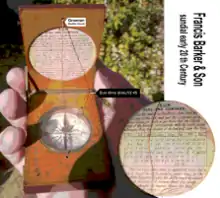 This hand-held wooden compass-sundial is unmarked, but believed to be made in London about the turn of the 19th/20th century by Francis Barker & son for field use. The crystal is cracked, and the gnomon cord has been replaced with green cotton fishing line probably in the 1950s