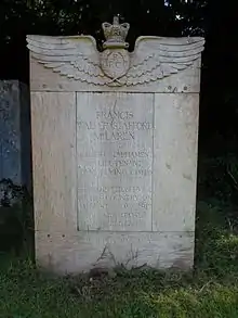 McLaren was a second lieutenant and trainee pilot in Number 18 Training Squadron (RNVR) when he died on 30 August 1917, following a flying accident during training at RAF Montrose.[4] His aeroplane, an AVRO 504A, nosedived into the sea off Montrose. He was pulled unconscious from the wreckage but died of internal injuries. He was buried in Busbridge churchyard, Godalming, Surrey on 5 September.