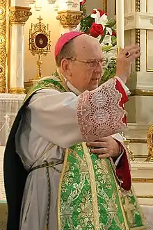 ![]() Bishop Reiss giving the blessing after pontifical low mass on August 12, 2012. | |