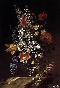 Francisco Pérez Sierra (c. 1627 in Naples – 1709) was a Neapolitan painter of Spanish origin. According to Antonio Palomino, he was the son of a Spanish general. He was a disciple of Aniello Falcone and Juan de Toledo. Numerous works that he painted included the Immaculate Conception, painted in 1655 in the convent of the Trinitarias de Madrid, Santa Ana conduciendo a la Virgen which is now at the Museo del Prado and Saint Joachim which is now at the Museo de Bellas Artes de Granada, he also painted Vase of Flowers in around 1690 (oil on panel, 62x43 cm) which is now at the Royal Palace in Madrid.
