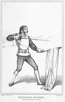 Little is known about his life. He was born in Ronda around 1700.[1] During the first years of the 18th century, at Ronda, Francisco Romero, at the end of a bullfight, asked for permission to kill the bull by himself. Up to this moment, only nobles mounted on horses dared to fight a bull, the so-called "bullfighting on horseback". That afternoon, however, Romero faced the bull on foot, and after provoking him and summoning him two or three times with a linen (small pieces of fabric draped over a stick), Romero killed the bull with the help of a long, curved sword, which he placed over the horns. The risk to the man, as well as the dramatic tension of this part of the spectacle, was thereby greatly increased,[3] and Romero soon repeated this process at other bullrings and he became an authentic professional, giving birth to the modern style of on foot bullfighting. The use of linens (white ones and hanging from a stick) could have been done before Romero's feat. Those linens evolved step by step towards the modern muleta or red cape and capote or purple and yellow cape, but it is very plausible that was Romero the one that popularized his use as the bullfight essential prop.