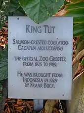 King Tut went appeared in several films, television shows, and theater productions, and was the "official greeter" of the zoo for decades, sitting on a perch inside the entrance to squawk at guests[44][45][48][49] Following King Tut's death in 1990, a bronze statue of the cockatoo was placed in the location of its longtime perch and remains there today, its plaque indicating that the bird "was brought from Indonesia in 1925 by Frank Buck".[49][50]