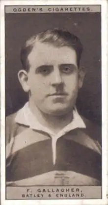 Frank Gallagher (c.1895 – 20 March 1966), was an English professional rugby league footballer who played in the 1920s. He played at representative level for Great Britain, England and Yorkshire, and at club level for Dewsbury, Batley and Leeds, as a stand-off, scrum-half, second-row, or loose forward, i.e. number 6, 7, 11 or 12, or, 13, during the era of contested scrums.[1]