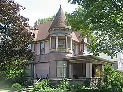 Frank and Katharine Coppes House, also known as the Victorian Guest House, now known as of January 2022, The Coppes House Bed and Breakfast, is a historic home located at Nappanee, Elkhart County, Indiana. It was built between 1887 and 1893, and is a 2+12-story, Queen Anne style frame dwelling. It has a complex hipped and gable roof and features a two-story, round corner tower with a conical roof and second story porch. It has a one-story wraparound porch and sheathed in clapboard and fish scale shingles.[2]:5