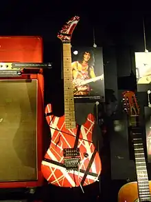 The Frankenstrat was Van Halen's attempt to combine the sound of a classic Gibson guitar with the physical attributes and tremolo bar functionality of a Fender Stratocaster. An early version of a Superstrat, the guitar was made from a Northern Ash Stratocaster body, with pickup routing which Van Halen modified to fit a Gibson PAF humbucking pickup in the bridge position.[1] The guitar has a maple neck and fretboard, chrome hardware, and was painted with a white over black design. This gave the appearance of a white guitar with black stripes. Later, red was painted over the original black and white. This now gave the appearance of a red guitar but was, in fact, just a third color sprayed over the original design. It has a standard six-string setup and a Floyd Rose tremolo.