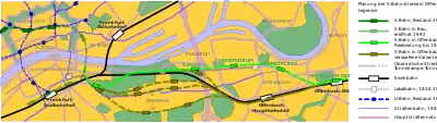 Prior to the construction of the line between Frankfurt and Offenbach, five different options were examined. Three options provided for the extension of the Frankfurt City Tunnel in different forms, in which a tunnel from Oberrad was planned in the southern (option D), middle (option C) or northern (option B) areas and the line would then run from the western boundary of the Offenbach built-up area parallel to the existing long-distance line towards Offenbach Hbf. However, these options would have meant—at least during the construction period, possibly also permanently due to changes in groundwater flows–a massive intervention in the usability of the areas for agriculture, so that some saw it as a threat to farms in Oberrad. After protests, the city of Frankfurt withdrew its original approval for the Oberrad routes.
