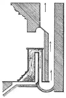 The earliest known example of such an inverted siphon was the 1618 fireplace of Franz Kessler.[9] The fire burned in a ceramic box. Inside the box and behind the fire was a baffle. The baffle forced the fire's fumes to descend behind the baffle before exiting to the chimney. The intention was to extract as much heat as possible from the fumes by extending the path that the fumes had to follow before they reached the chimney.
