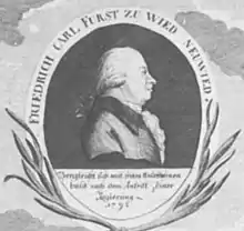 Franz Karl Ludwig von Wied zu Neuwied (19 October 1710 – 9 October 1765, in Neuwied) was a lieutenant general in Frederick the Great's army. He received the Order of the Black Eagle and was proprietor of the 41st Infantry Regiment. His name is inscribed on the Equestrian statue of Frederick the Great.[1]