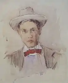 In 1893, Frieseke graduated from Owosso High School, then began his artistic training at the Art Institute of Chicago,[2] studying with Frederick Warren Freer and John Vanderpoel.[3] After moving to New York in 1895,[2] he resumed his art education at the Art Students League in 1897.[5] He worked as an illustrator, selling cartoons he had drawn to The New York Times, Puck, and Truth. He claimed that he might have curtailed his art education if he had been more successful in that endeavor.[6] The following year, he moved to France, where he would remain, except for short visits to the United States and elsewhere, as an expatriate for the rest of his life.[7] He did continue his education, enrolling at the Académie Julian in Paris, studying under Jean-Joseph Benjamin-Constant and Jean-Paul Laurens,[3] and receiving criticism from Auguste Joseph Delécluse.[8] His studies also included some time at Académie Carmen under James Abbott McNeill Whistler.[3] Frieseke visited Holland, including the Katwijk and Laren artist colonies, in the summer of 1898. During this time he sketched and painted in watercolors, and he initially planned to make that his specialty,[9] but he was encouraged by Académie Carmen instructor Frederick William MacMonnies to work in oils.[4]