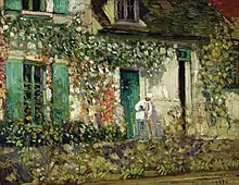 In the summer of 1905, he spent at least a month in the Giverny art colony.[12] In October of that year he married Sarah Anne O'Bryan[13] (known as Sadie),[14] whom he had met seven years earlier.[15] Frieseke and his wife (and later, their daughter) spent every summer from 1906 to 1919 in Giverny.[4] He kept a Paris apartment and studio throughout his life,[8] and the Friesekes spent the winters in Paris.[16] Their Giverny house, previously the residence of Theodore Robinson, was next door to Claude Monet's. Despite the proximity, Frieseke did not become close friends with Monet, nor was Monet an artistic influence.[11] He said in an interview, "No artist in [the impressionist] school has influenced me except, perhaps, Renoir."[2] Indeed, Frieseke's paintings of sensually rounded figures often bear a resemblance to those of Pierre-Auguste Renoir.[11]