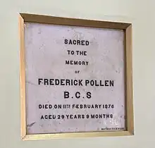 Frederick Pollen (1847 - 11 February 1876) was a British District Collector at Bulandshahr, India. He had been a student at Dublin University, and passed the examination for the Indian Civil Service and Home Civil Service in first class in 1867,[1] taking 13th place.[2] In 1869 he was assistant magistrate and collector at Meerut.[3] He married Emily Charlotte (née Patrick).[4] The old District Gazetteer of Bulandshahr is largely based on his work, along with Raja Lachhman Singh, and on the settlement report by R. G. Currie.[5] Pollen died in Bulandshahr on 11 February 1876, at the age of 29.[6][7]
