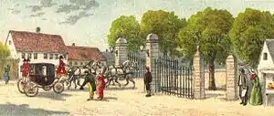 Frederiksberg Allé was finally opened to private traffic in 1833. The iron gate was dismantled in 1862 and later installed at Søndermarken's entrance on the corner of Pile Allé and Roskildevej. The south side of the street had long remained more open but in the years after 1850 it was built over with private villas.