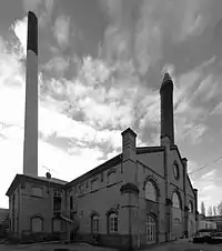 The plant originally consisted of several buildings. A single complex of interconnected volumes still exists today. It consists of the former electricity plant and a boilerhouse which are placed parallel but offset relative to each other. The 60 metres high brick chimney has also been retained at the site.[1]