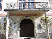 Access to the interior of the castle is provided by a round-arched granite portal. Above the portal there is a balcony resting on two columns, from which a double door leads to the interior. The wrought-iron balcony lattice is artistically executed. Above the gate axis there is a round gable with a clock and an attached turret. The facade is articulated with reddish flaps, while the windows are also framed in the same color.