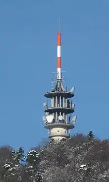 Fremersberg Tower (German: Fremersbergturm) is an 83-metre-tall (272 ft) telecommunication tower built of reinforced concrete with an observation deck 30 metres above ground. There is a small restaurant located next to the tower. Fremersberg Tower, which was built in 1961 is situated on 525-metre-high (1,722 ft) Fremersberg near Baden-Baden at 8°12'8" E and 48°45'10" N.