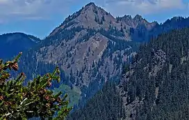 French Cabin Mountain is a triple-peak mountain located in Kittitas County of Washington state.[3] The highest summit is West Peak, elevation 5,724-feet, the South Peak is 5,560-feet-elevation, and the North Peak is 5,498-feet.[1] French Cabin Mountain is situated six miles north of Easton, between Kachess Lake and Cle Elum Lake, on land managed by Okanogan-Wenatchee National Forest. Precipitation runoff from the mountain drains north into French Cabin Creek and south into Silver Creek, which are both part of the Yakima River drainage basin. Topographic relief is significant as the summit rises 1,700 feet (520 meters) above Silver Creek in one mile, and the east aspect rises 3,400 feet (1,000 meters) above Cle Elum Lake in one and a half miles (2.4 km). French Cabin Mountain is the toponym officially adopted by the U.S. Board on Geographic Names, however "Frenchman Mountain" is a variant.[3] West Peak is also an official toponym.[4]
