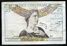 The franc was the currency of French Guiana until 2002. The French franc circulated alongside banknotes issued specifically for French Guiana between 1888 and 1961 and notes issued for French Guiana, Guadeloupe and Martinique (collectively referred to as the French Antilles) between 1961 and 1975.