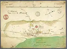 The basic structure of the compagnies franches de la marine, as the infantry of the troupes de la marine were called after 1690, remained unchanged between 1690 and 1761.[4] Through the initiative of governor Denonville, the rank of second ensign was added to the complement in 1699, explicitly in order to recruit young Canadians of good families to the officer corps.[5] Although the free companies per definition lacked a higher organization, a small staff existed above company level, containing a surgeon, a chaplain, a clerk of the muster, and a drum-major. In 1687 the rank of "commandant of the troops in Canada" was created, with a major as his chief of staff added to the organization in 1691.[6]