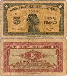 The franc was the currency of French West Africa. The French franc circulated, together with distinct banknotes from 1903 and coins from 1944. It was replaced by the CFA franc in 1945.