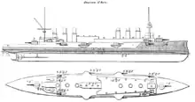 Plan and right elevation of Jeanne d'Arc from Brassey's Naval Annual 1915, showing the armour layout and positions of the guns. (The plan is incorrect regarding the upper superstructure and the position of the second 138 mm (5.5 in) gun on upper deck — it should be in the middle of the ship.)