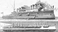 Jeanne d'Arc was originally conceived in the early 1890s as a large protected cruiser for overseas service, but the design was recast as an armoured cruiser by the naval architect Emile Bertin, director of the Navy's Technical Section (Section technique) in 1895.[1] His design is regarded as unsuccessful with too light an armament for her size and failing to achieve her designed speed.[2][3] The ship measured 147 metres (482 ft 3 in) long overall with a beam of 19.42 metres (63 ft 9 in) and had a maximum draught of 8 metres (26 ft 3 in). She displaced 11,264 tonnes (11,086 long tons) at normal load and had a metacentric height of 1.458 metres (5 ft). The hull was subdivided by 15 watertight bulkheads that extended from her double bottom to the main armoured deck.[4] Jeanne d'Arc had a crew of 651.[3]