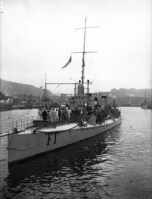 When the First World War began in August 1914, Fleuret was still assigned to the 2nd Destroyer Flotilla[3] based at Brest and remained with that unit until mid-1915. She was transferred to the North Sea Flotilla (Flotille de la mer du Nord), based at Dunkerque, the following year. In February 1916, the ship was badly damaged in a collision with the destroyer Aventurier and was under repair at Le Havre until November. Fleuret was assigned to the Normandy Patrol Boat Division (Division des patrouilleurs de Normandie) at Cherbourg in 1918. The ship was struck from the naval register on 12 January 1920 and served as a towed target from January 1921 until her sinking in 1923.[2]