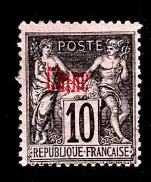For the above post offices, the French government issued stamps of the "Peace and Commerce" series overprinted with the word "CHINE" beginning in 1894. Stamp issues of the 20th century initially included overprints applied to some of the stamps issued for use in French Indochina, and continued with stamps printed specifically for use in China. Some earlier 20th century stamps were issued only with face values expressed in French francs, but all later issues were overprinted with the equivalent of the stamp’s Chinese currency face value expressed in both French and Chinese.