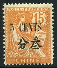 French stamp overprinted with Chinese currency face value in French and Chinese.